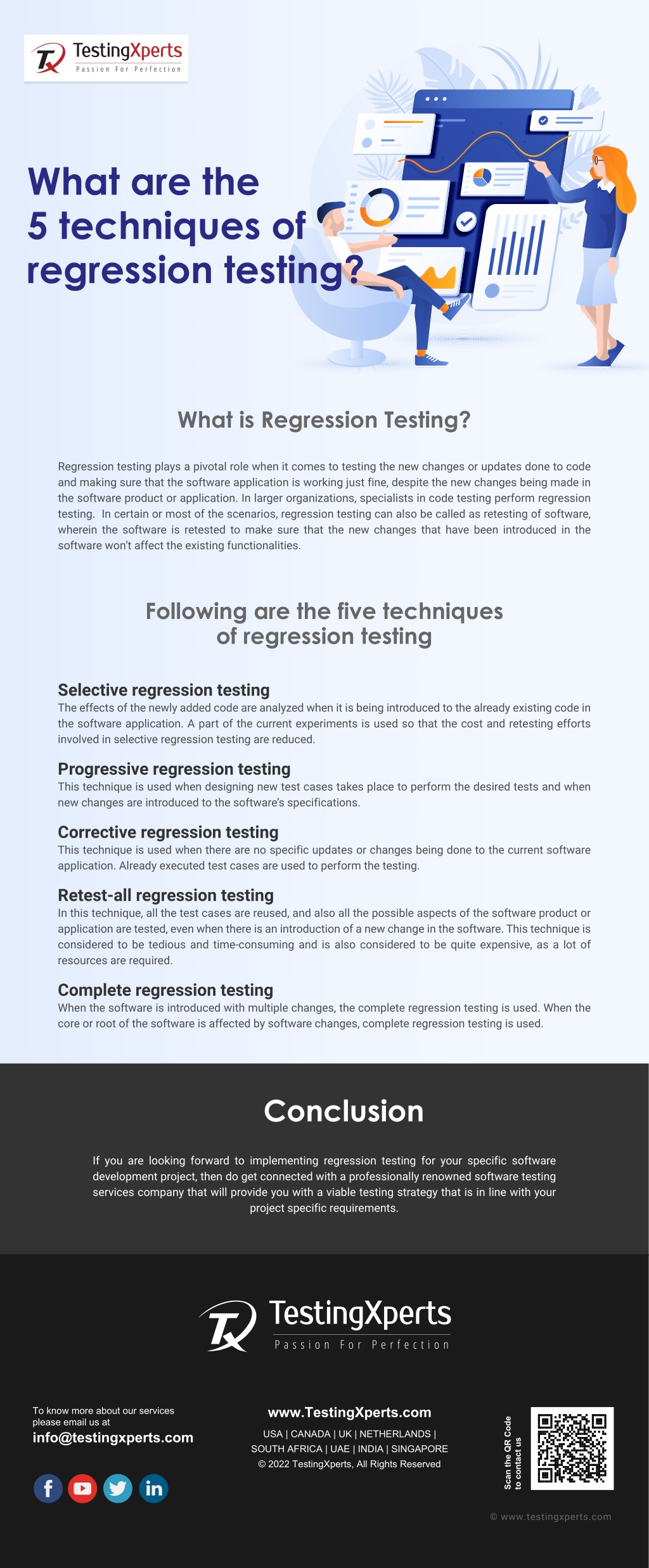 What are the 5 techniques of regression testing? What is Regression Testing? Regression testing plays a pivotal role when it comes to testing the new changes or updates done to code and making sure that the software application is working just fine, despite the new changes being made in the software product or application. In larger organizations, specialists in code testing perform regression testing. In certain or most of the scenarios, regression testing can also be called as retesting of software, wherein the software is retested to make sure that the new changes that have been introduced in the software won’t affect the existing functionalities. Following are the five techniques of regression testing Selective regression testing The effects of the newly added code are analyzed when it is being introduced to the already existing code in the software application. A part of the current experiments is used so that the cost and retesting efforts involved in selective regression testing are reduced. Progressive regression testing This technique is used when designing new test cases takes place to perform the desired tests and when new changes are introduced to the software’s specifications. Corrective regression testing This technique is used when there are no specific updates or changes being done to the current software application. Already executed test cases are used to perform the testing. Retest-all regression testing In this technique, all the test cases are reused, and also all the possible aspects of the software product or application are tested, even when there is an introduction of a new change in the software. This technique is considered to be tedious and time-consuming and is also considered to be quite expensive, as a lot of resources are required. Complete regression testing When the software is introduced with multiple changes, the complete regression testing is used. When the core or root of the software is affected by software changes, complete regression testing is used. Conclusion If you are looking forward to implementing regression testing for your specific software development project, then do get connected with a professionally renowned software testing services company that will provide you with a viable testing strategy that is in line with your project specific requirements. www.TestingXperts.com To know more about our services please email us at info@testingxperts.com Scan the QR Code USA | CANADA | UK | NETHERLANDS | SOUTH AFRICA | UAE | INDIA | SINGAPORE © 2022 TestingXperts, All Rights Reserved to contact us © www.testingxperts.com