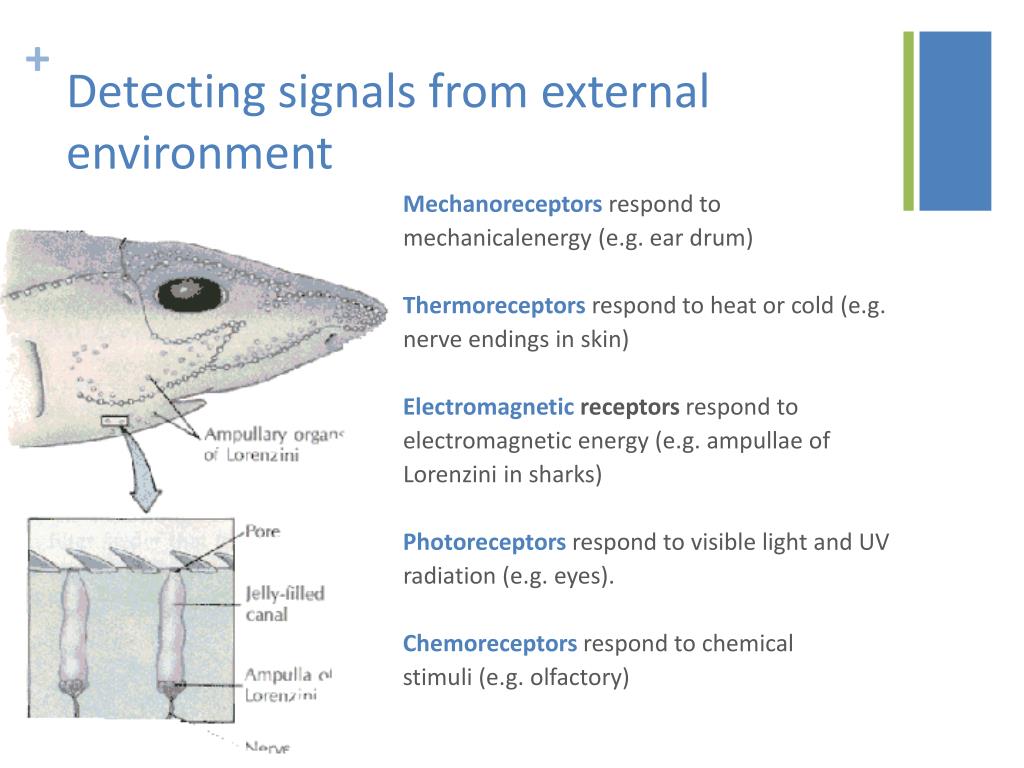 Detecting signals from external environment Mechanoreceptorsrespond to mechanicalenergy (e.g. ear drum) Thermoreceptorsrespond to heat or cold (e.g. nerve endings in skin) Electromagnetic receptors respond to electromagnetic energy (e.g. ampullae of Lorenzini in sharks) Photoreceptorsrespond to visible light and UV radiation (e.g. eyes). Chemoreceptors respond to chemical stimuli (e.g. olfactory)