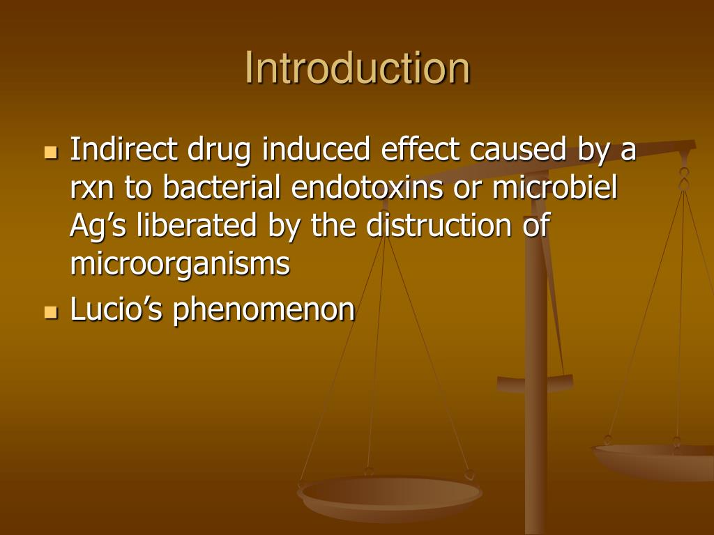 Introduction • Indirect drug induced effect caused by a rxn to bacterial endotoxins or microbiel Ag’s liberated by the distruction of microorganisms • Lucio’s phenomenon