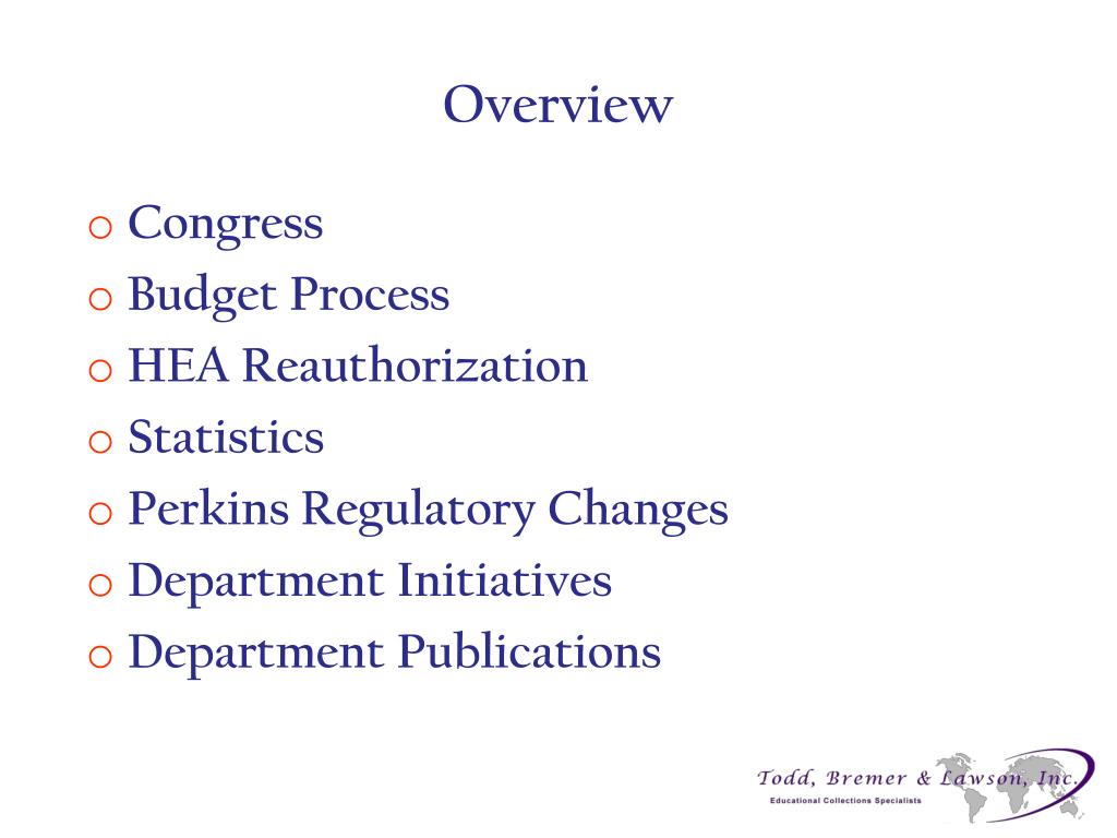 Legislative and Department of Education Update Spring 2014 Lori S. Hartung Regional Sales Manager Todd, Bremer & Lawson, Inc. P.O. Box 36788 Rock Hill, SC 29732-0512 800.849.6669 lori.hartung@tbandl.com. Overview. Congress Budget Process HEA Reauthorization Statistics