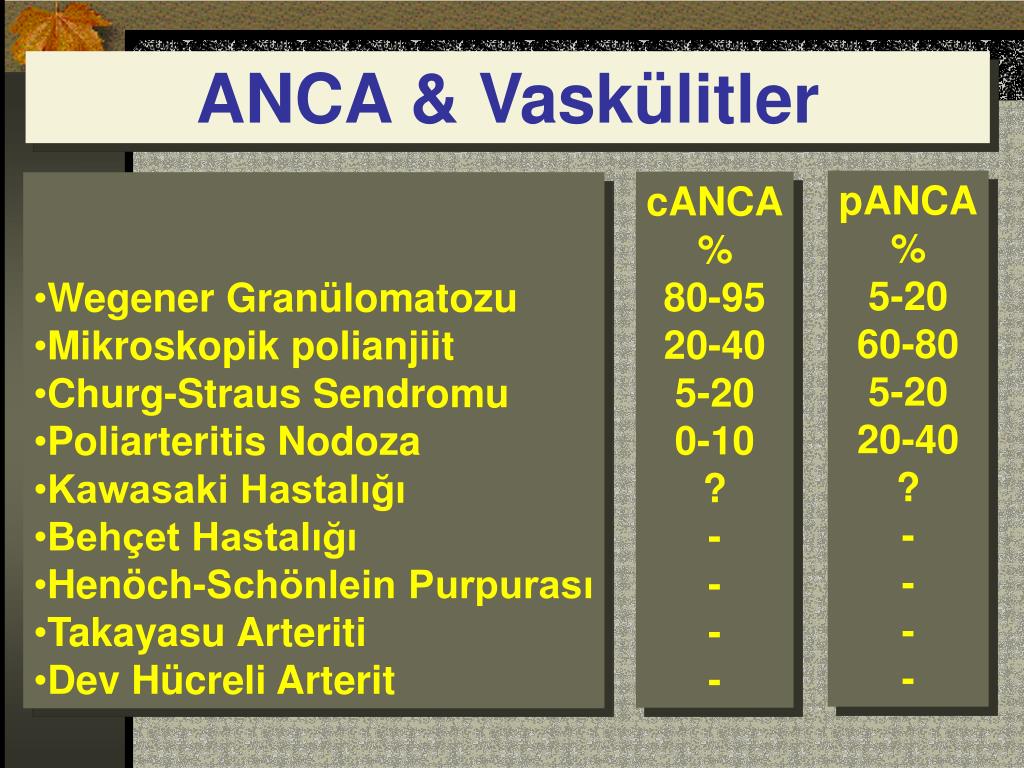 Anti-Nötrofil Sitoplazmik Ab.(ANCA) • 1982-Davies ve ark. • Küçük ve orta boy vaskülit patogenezi • Üç ayrı tip ANCA • perinükleer : pANCA • sitoplazmik : cANCA • atipik
