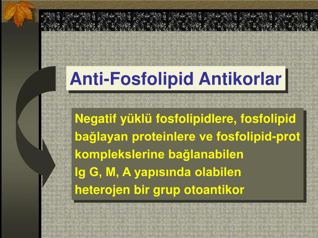 Anti-Fosfolipid Antikorlar Negatif yüklü fosfolipidlere, fosfolipid bağlayan proteinlere ve fosfolipid-prot komplekslerine bağlanabilen Ig G, M, A yapısında olabilen heterojen bir grup otoantikor