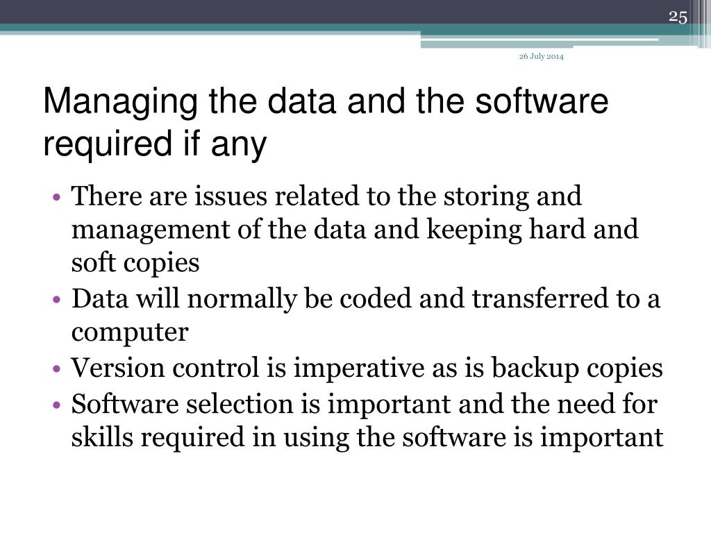 Managing the data and the software required if any • There are issues related to the storing and management of the data and keeping hard and soft copies • Data will normally be coded and transferred to a computer • Version control is imperative as is backup copies • Software selection is important and the need for skills required in using the software is important