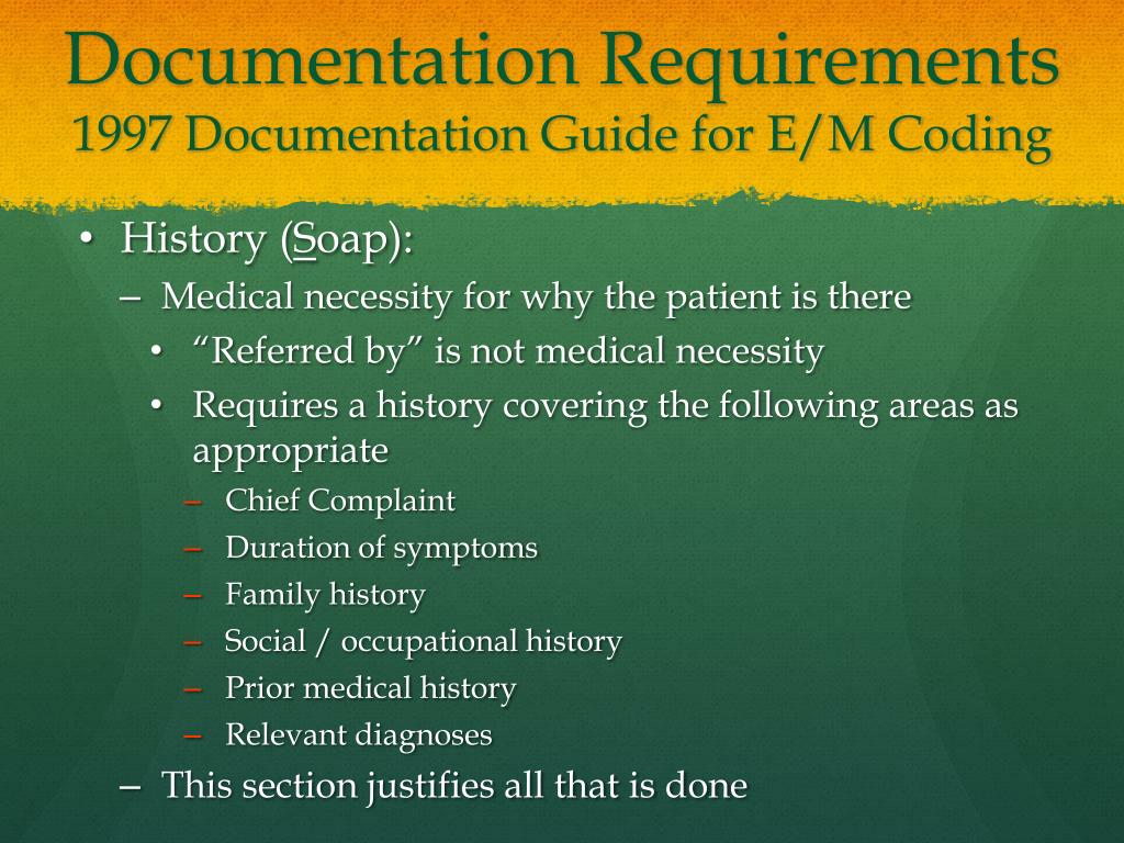 Documentation Requirements1997 Documentation Guide for E/M Coding • History (Soap): • Medical necessity for why the patient is there • “Referred by” is not medical necessity • Requires a history covering the following areas as appropriate • Chief Complaint • Duration of symptoms • Family history • Social / occupational history • Prior medical history • Relevant diagnoses • This section justifies all that is done