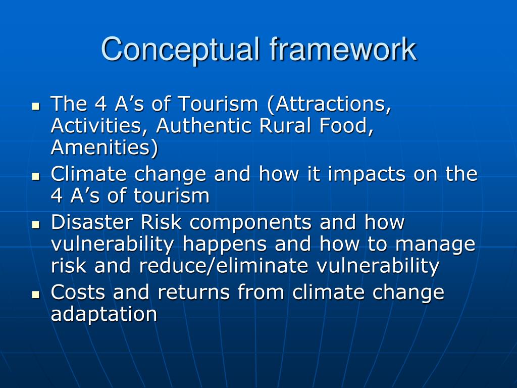 Conceptual framework • The 4 A’s of Tourism (Attractions, Activities, Authentic Rural Food, Amenities) • Climate change and how it impacts on the 4 A’s of tourism • Disaster Risk components and how vulnerability happens and how to manage risk and reduce/eliminate vulnerability • Costs and returns from climate change adaptation