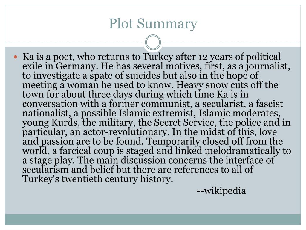 Plot Summary Ka is a poet, who returns to Turkey after 12 years of political exile in Germany. He has several motives, first, as a journalist, to investigate a spate of suicides but also in the hope of meeting a woman he used to know. Heavy snow cuts off the town for about three days during which time Ka is in conversation with a former communist, a secularist, a fascist nationalist, a possible Islamic extremist, Islamic moderates, young Kurds, the military, the Secret Service, the police and in particular, an actor-revolutionary. In the midst of this, love and passion are to be found. Temporarily closed off from the world, a farcical coup is staged and linked melodramatically to a stage play. The main discussion concerns the interface of secularism and belief but there are references to all of Turkey's twentieth century history. --wikipedia
