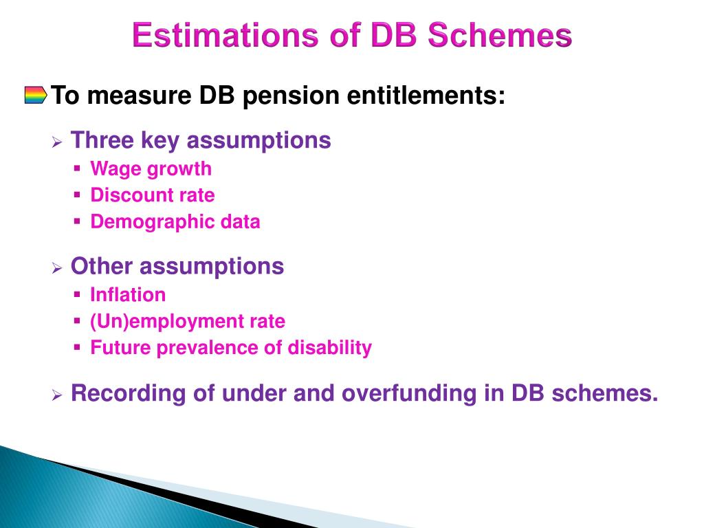 Estimations of DB Schemes To measure DB pension entitlements: • Three key assumptions • Wage growth • Discount rate • Demographic data • Other assumptions • Inflation • (Un)employment rate • Future prevalence of disability • Recording of under and overfunding in DB schemes.
