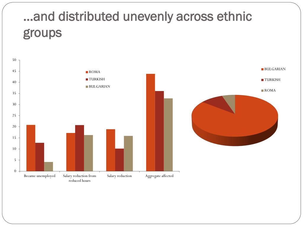 Context • Macroeconomic impact of crisis hit Bulgaria primarily in 2009 • Impact of the Crisis: GDP declined 5% in 2009 • Microeconomic impacts tend to lag • Open Society Institute Sofia and the World Bank collaborated to assess the impact of the crisis on households • Survey conducted in February/March 2010 • Nationally representative survey of 2400 households • An additional 300 households were surveyed in primarily Roma settlements