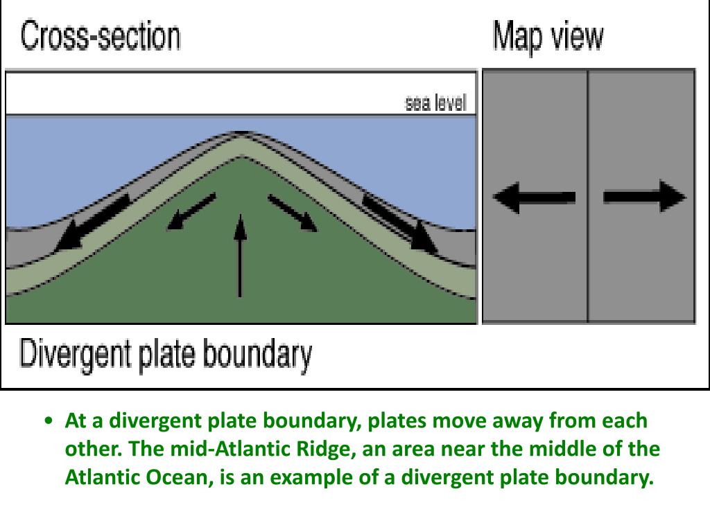 At a divergent plate boundary, plates move away from each other. The mid-Atlantic Ridge, an area near the middle of the Atlantic Ocean, is an example of a divergent plate boundary.