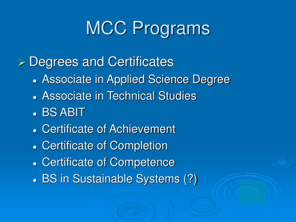 MCC Programs • Degrees and Certificates • Associate in Applied Science Degree • Associate in Technical Studies • BS ABIT • Certificate of Achievement • Certificate of Completion • Certificate of Competence • BS in Sustainable Systems (?)