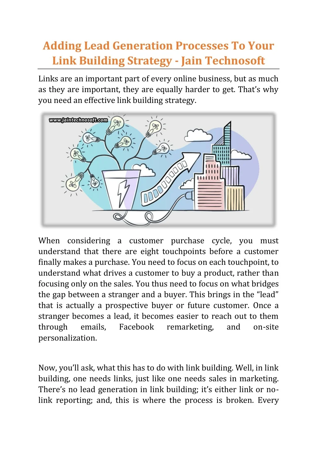 Adding Lead Generation Processes To Your Link Building Strategy - Jain Technosoft Links are an important part of every online business, but as much as they are important, they are equally harder to get. That’s why you need an effective link building strategy. When considering a customer purchase cycle, you must understand that there are eight touchpoints before a customer finally makes a purchase. You need to focus on each touchpoint, to understand what drives a customer to buy a product, rather than focusing only on the sales. You thus need to focus on what bridges the gap between a stranger and a buyer. This brings in the “lead” that is actually a prospective buyer or future customer. Once a stranger becomes a lead, it becomes easier to reach out to them through emails, Facebook personalization. remarketing, and on-site Now, you’ll ask, what this has to do with link building. Well, in link building, one needs links, just like one needs sales in marketing. There’s no lead generation in link building; it’s either link or no- link reporting; and, this is where the process is broken. Every