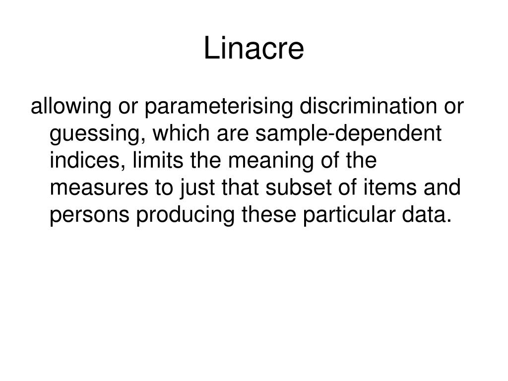 Linacre allowing or parameterising discrimination or guessing, which are sample-dependent indices, limits the meaning of the measures to just that subset of items and persons producing these particular data.