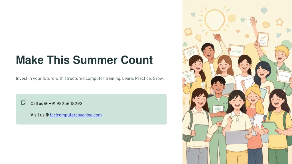 Make This Summer Count Invest in your future with structured computer training. Learn. Practice. Grow. Call us @ Call us @ +91 98256 18292 Visit us @ Visit us @ tccicomputercoaching.com