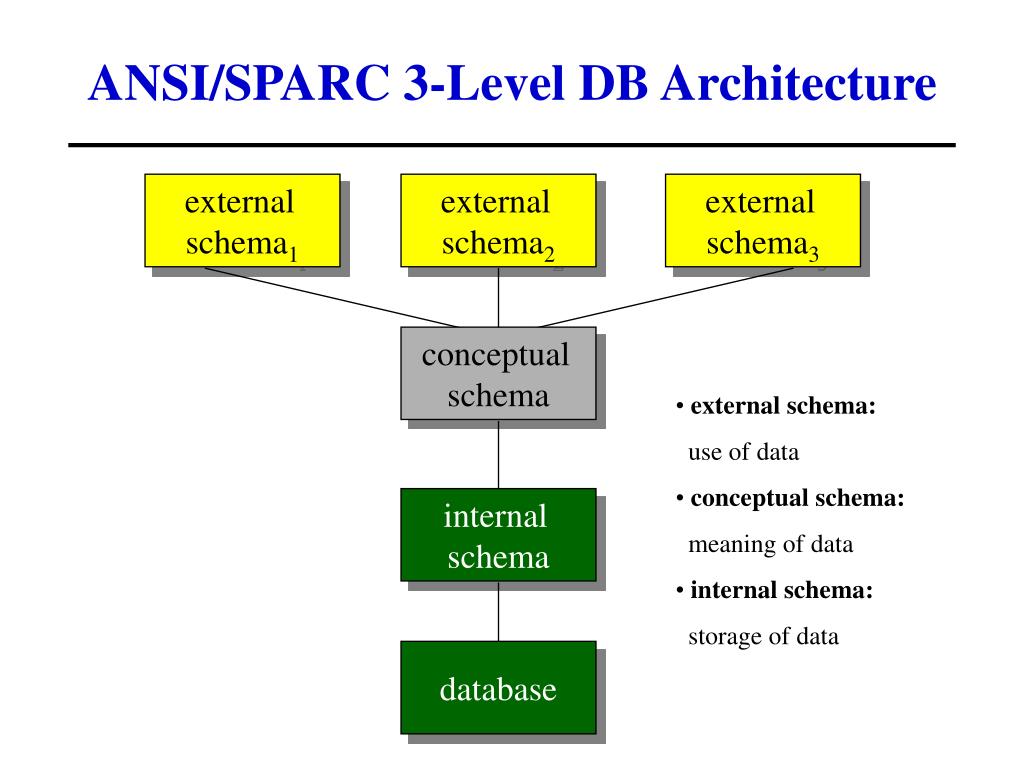 ANSI/SPARC 3-Level DB Architecture external schema1 external schema2 external schema3 conceptual schema • external schema: • use of data • conceptual schema: • meaning of data • internal schema: • storage of data internal schema database