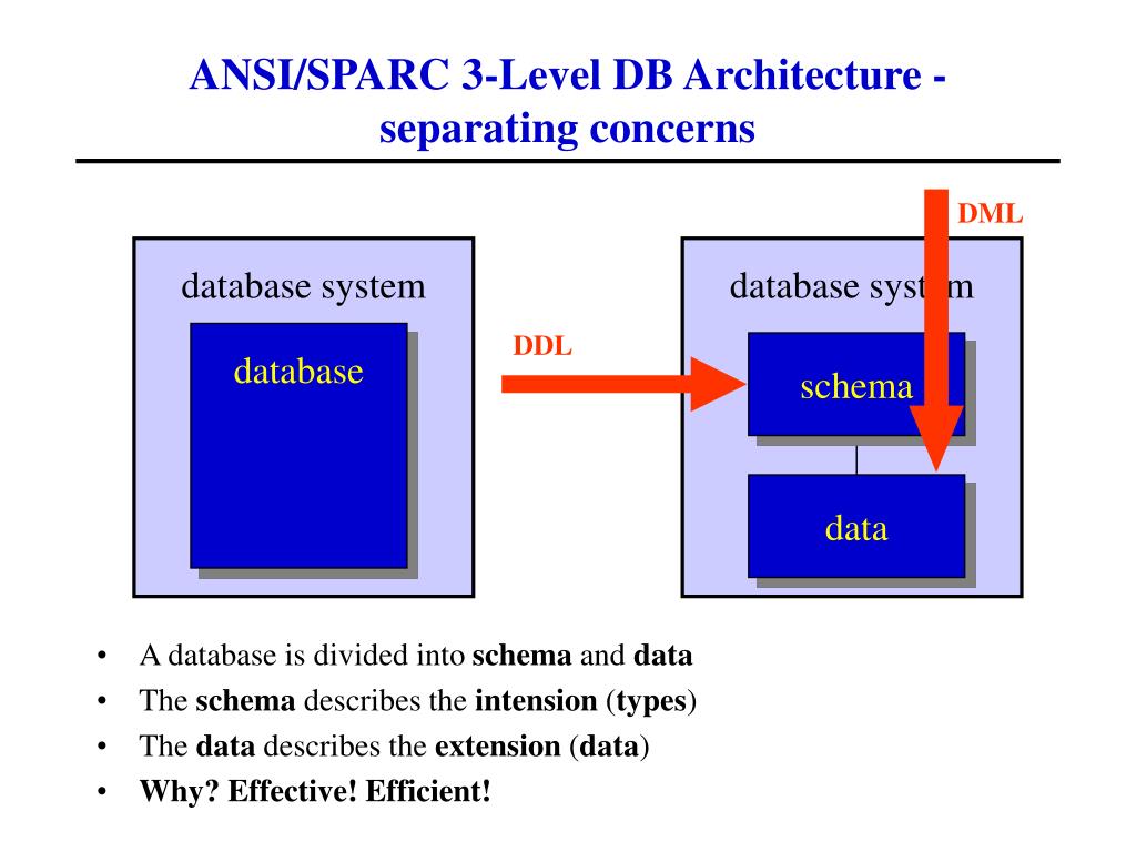 DML database system database system DDL schema database data ANSI/SPARC 3-Level DB Architecture - separating concerns • A database is divided into schema and data • The schema describes the intension (types) • The data describes the extension (data) • Why? Effective! Efficient!