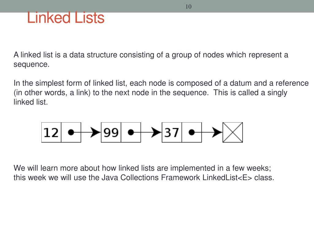 Linked Lists A linked list is a data structure consisting of a group of nodes which represent a sequence. In the simplest form of linked list, each node is composed of a datum and a reference (in other words, a link) to the next node in the sequence. This is called a singly linked list. We will learn more about how linked lists are implemented in a few weeks; this week we will use the Java Collections Framework LinkedList<E> class.