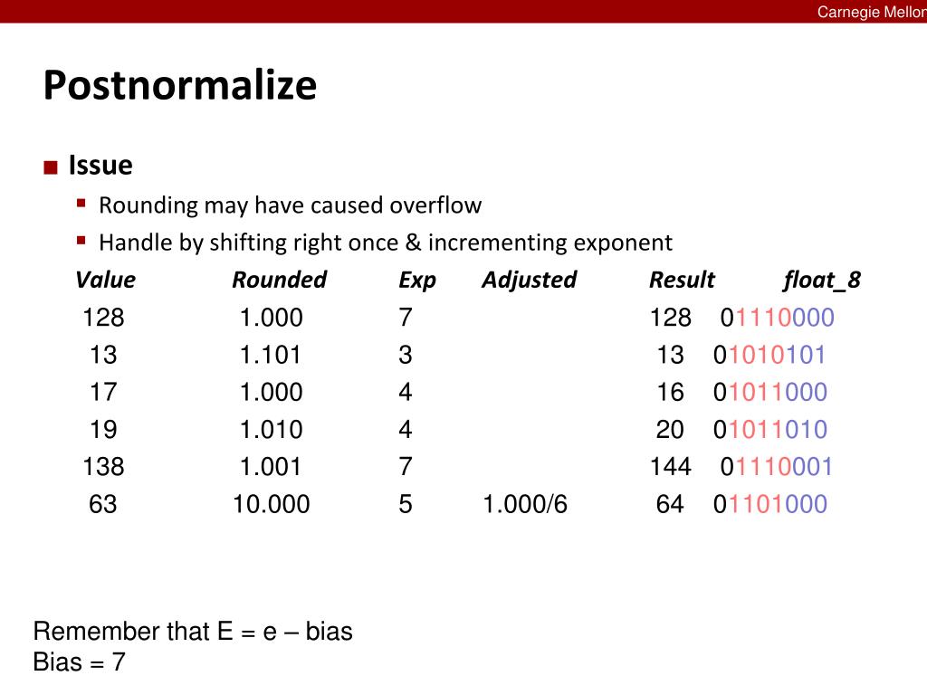Carnegie Mellon Normalize • Requirement • Set binary point so that numbers of form 1.xxxxx • Adjust all to have leading one • Decrement exponent as shift left ValueBinaryFractionExponent 128100000001.00000007 13000011011.10100003 17000100011.00010004 19000100111.00110004 138100010101.00010107 63001111111.11111005