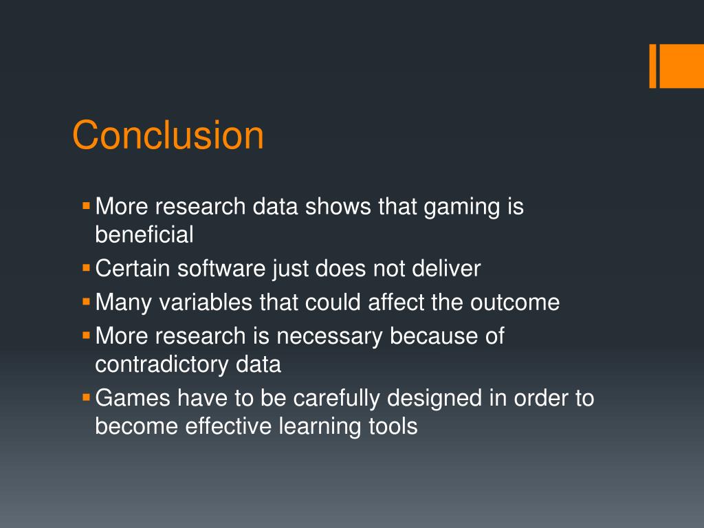 Conclusion • More research data shows that gaming is beneficial • Certain software just does not deliver • Many variables that could affect the outcome • More research is necessary because of contradictory data • Games have to be carefully designed in order to become effective learning tools