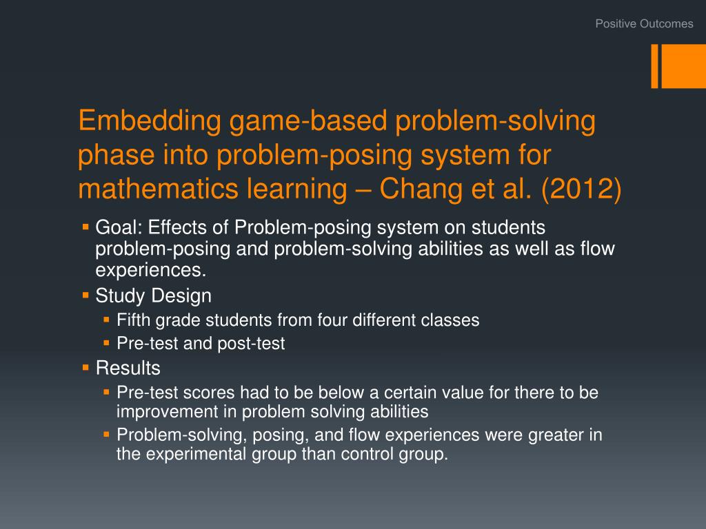 Embedding game-based problem-solving phase into problem-posing system for mathematics learning – Chang et al. (2012) • Goal: Effects of Problem-posing system on students problem-posing and problem-solving abilities as well as flow experiences. • Study Design • Fifth grade students from four different classes • Pre-test and post-test • Results • Pre-test scores had to be below a certain value for there to be improvement in problem solving abilities • Problem-solving, posing, and flow experiences were greater in the experimental group than control group.