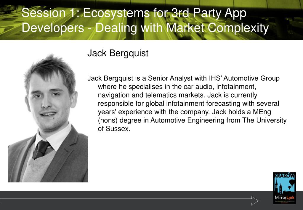 Session 1: Ecosystems for 3rd Party App Developers - Dealing with Market Complexity • Jack Bergquist • Jack Bergquist is a Senior Analyst with IHS’ Automotive Group where he specialises in the car audio, infotainment, navigation and telematics markets. Jack is currently responsible for global infotainment forecasting with several years’ experience with the company. Jack holds a MEng (hons) degree in Automotive Engineering from The University of Sussex.