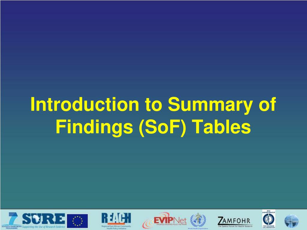Summarising findings about the likely impacts of options. Judgements about the quality of evidence Preparing summary of findings tables Plain language summaries. Introduction to Summary of Findings (SoF) Tables. Why bother?. SURE policy briefs are intended to help people make decisions.