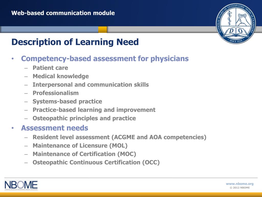 Web-based communication module Description of Learning Need • Competency-based assessment for physicians • Patient care • Medical knowledge • Interpersonal and communication skills • Professionalism • Systems-based practice • Practice-based learning and improvement • Osteopathic principles and practice • Assessment needs • Resident level assessment (ACGME and AOA competencies) • Maintenance of Licensure (MOL) • Maintenance of Certification (MOC) • Osteopathic Continuous Certification (OCC)