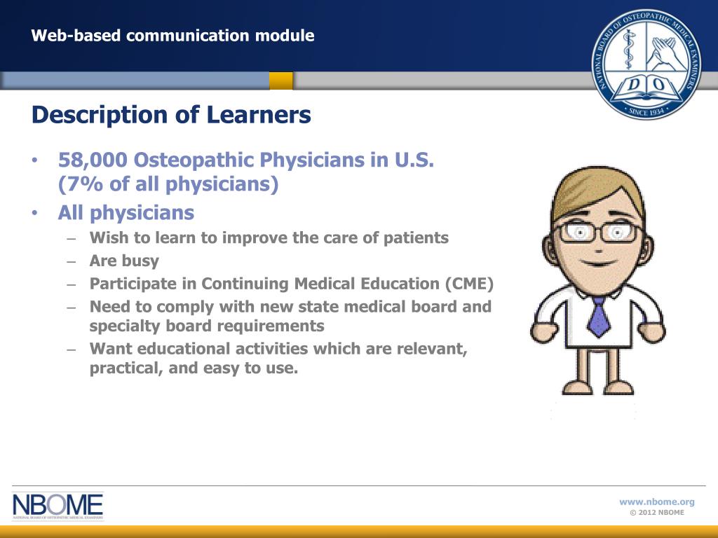 Web-based communication module Description of Learners • 58,000 Osteopathic Physicians in U.S. (7% of all physicians) • All physicians • Wish to learn to improve the care of patients • Are busy • Participate in Continuing Medical Education (CME) • Need to comply with new state medical board and specialty board requirements • Want educational activities which are relevant, practical, and easy to use.