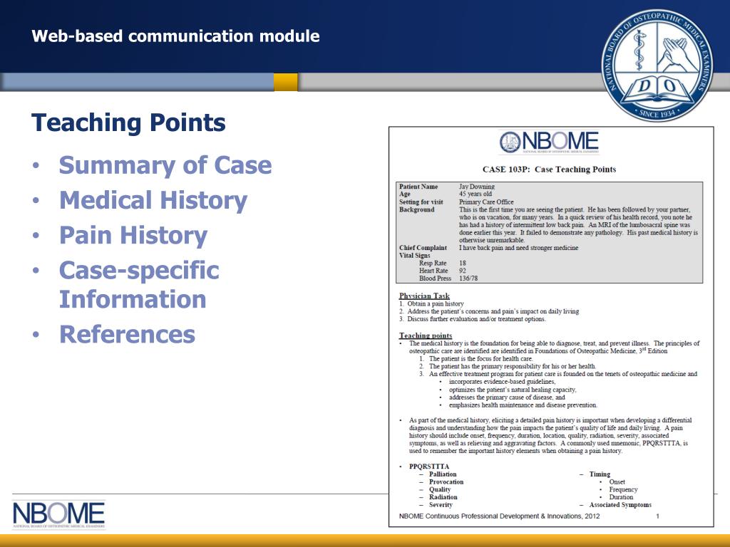 Web-based communication module Teaching Points • Summary of Case • Medical History • Pain History • Case-specific Information • References