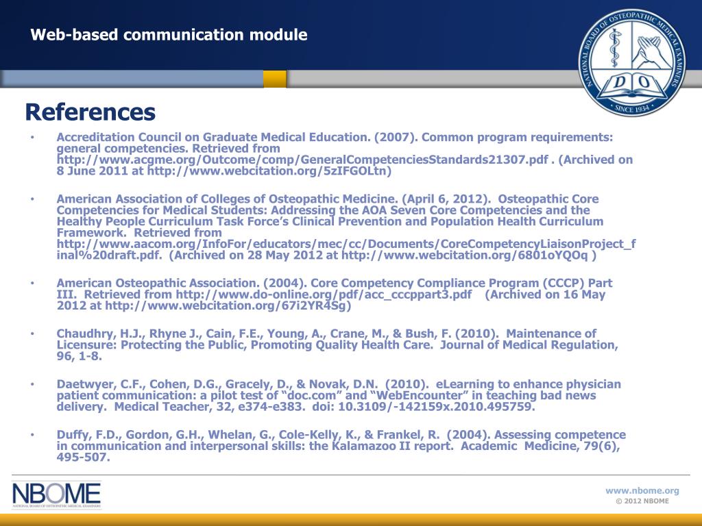 Web-based communication module References • Accreditation Council on Graduate Medical Education. (2007). Common program requirements: general competencies. Retrieved from http://www.acgme.org/Outcome/comp/GeneralCompetenciesStandards21307.pdf . (Archived on 8 June 2011 at http://www.webcitation.org/5zIFGOLtn) • American Association of Colleges of Osteopathic Medicine. (April 6, 2012). Osteopathic Core Competencies for Medical Students: Addressing the AOA Seven Core Competencies and the Healthy People Curriculum Task Force’s Clinical Prevention and Population Health Curriculum Framework. Retrieved from http://www.aacom.org/InfoFor/educators/mec/cc/Documents/CoreCompetencyLiaisonProject_final%20draft.pdf. (Archived on 28 May 2012 at http://www.webcitation.org/6801oYQOq ) • American Osteopathic Association. (2004). Core Competency Compliance Program (CCCP) Part III. Retrieved from http://www.do-online.org/pdf/acc_cccppart3.pdf (Archived on 16 May 2012 at http://www.webcitation.org/67i2YR4Sg) • Chaudhry, H.J., Rhyne J., Cain, F.E., Young, A., Crane, M., & Bush, F. (2010). Maintenance of Licensure: Protecting the Public, Promoting Quality Health Care. Journal of Medical Regulation, 96, 1-8. • Daetwyer, C.F., Cohen, D.G., Gracely, D., & Novak, D.N. (2010). eLearning to enhance physician patient communication: a pilot test of “doc.com” and “WebEncounter” in teaching bad news delivery. Medical Teacher, 32, e374-e383. doi: 10.3109/-142159x.2010.495759. • Duffy, F.D., Gordon, G.H., Whelan, G., Cole-Kelly, K., & Frankel, R. (2004). Assessing competence in communication and interpersonal skills: the Kalamazoo II report. Academic Medicine, 79(6), 495-507.