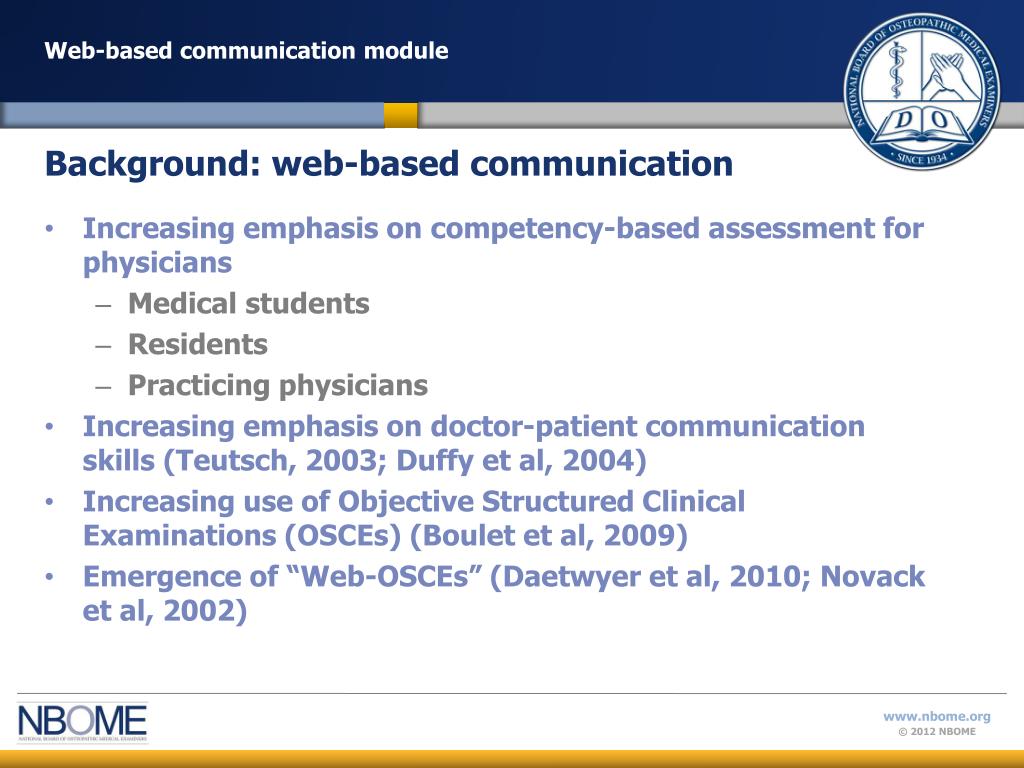 Web-based communication module Background: web-based communication • Increasing emphasis on competency-based assessment for physicians • Medical students • Residents • Practicing physicians • Increasing emphasis on doctor-patient communication skills (Teutsch, 2003; Duffy et al, 2004) • Increasing use of Objective Structured Clinical Examinations (OSCEs) (Boulet et al, 2009) • Emergence of “Web-OSCEs” (Daetwyer et al, 2010; Novack et al, 2002)