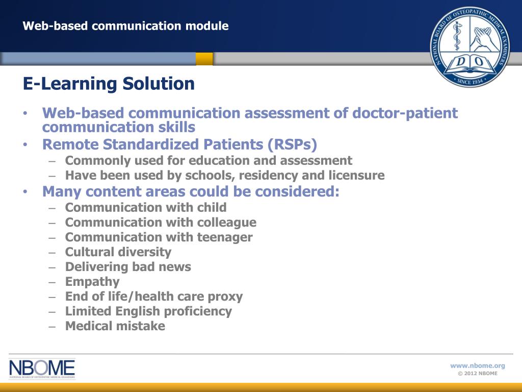 Web-based communication module E-Learning Solution • Web-based communication assessment of doctor-patient communication skills • Remote Standardized Patients (RSPs) • Commonly used for education and assessment • Have been used by schools, residency and licensure • Many content areas could be considered: • Communication with child • Communication with colleague • Communication with teenager • Cultural diversity • Delivering bad news • Empathy • End of life/health care proxy • Limited English proficiency • Medical mistake