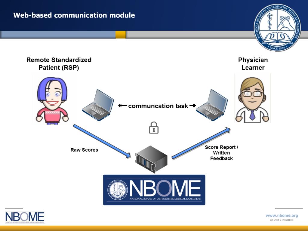 Web-based communication module Remote Standardized Patient (RSP) Experience • Training documents • Technology Set Up Procedures • Skype Trouble Shooting • Encounter Instructions • Scheduling • Pre-encounter • Skype Username • Skype Account • SuperTinTin • Encounter • Doctor-patient communication (15 min) • Complete evaluation forms (5 min) • Verbal Feedback (10 min) • Support: 24-hour staff support (phone) • Post-encounter • Complete evaluations: checklist, global assessment, technology report • Upload video to NBOME research website • Survey of experience • NBOME Staff support throughout experience (phone, email and Skype)