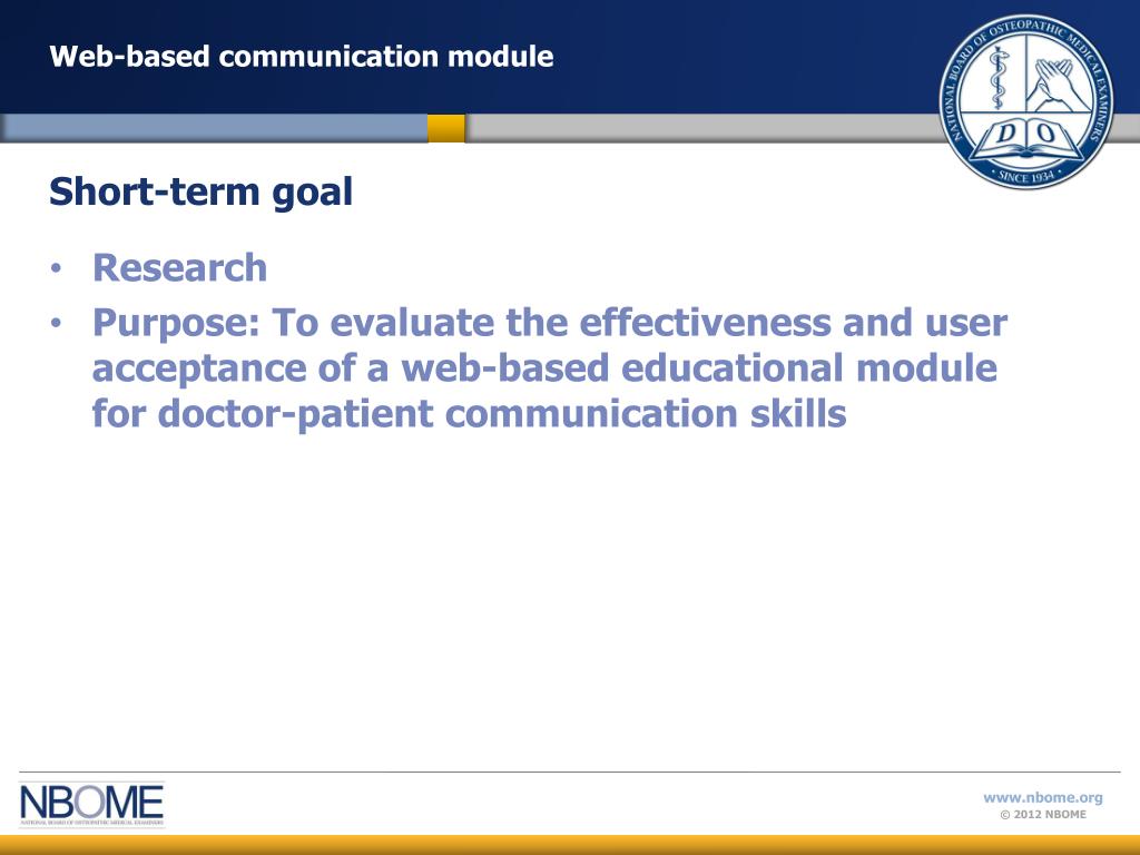 Web-based communication module Short-term goal • Research • Purpose: To evaluate the effectiveness and user acceptance of a web-based educational module for doctor-patient communication skills