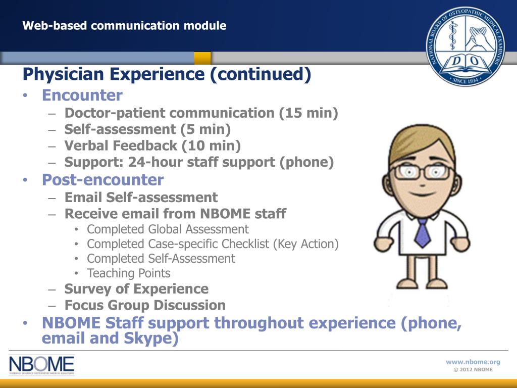 Web-based communication module Physician Experience (continued) • Encounter • Doctor-patient communication (15 min) • Self-assessment (5 min) • Verbal Feedback (10 min) • Support: 24-hour staff support (phone) • Post-encounter • Email Self-assessment • Receive email from NBOME staff • Completed Global Assessment • Completed Case-specific Checklist (Key Action) • Completed Self-Assessment • Teaching Points • Survey of Experience • Focus Group Discussion • NBOME Staff support throughout experience (phone, email and Skype)