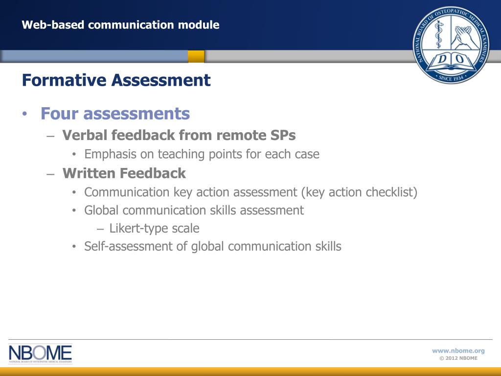 Web-based communication module Formative Assessment • Four assessments • Verbal feedback from remote SPs • Emphasis on teaching points for each case • Written Feedback • Communication key action assessment (key action checklist) • Global communication skills assessment • Likert-type scale • Self-assessment of global communication skills