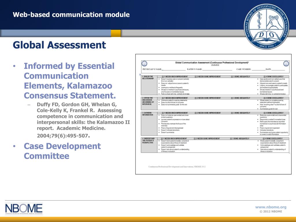 Web-based communication module Global Assessment • Informed by Essential Communication Elements, Kalamazoo Consensus Statement. • Duffy FD, Gordon GH, Whelan G, Cole-Kelly K, Frankel R. Assessing competence in communication and interpersonal skills: the Kalamazoo II report. Academic Medicine. 2004;79(6):495-507. • Case Development Committee