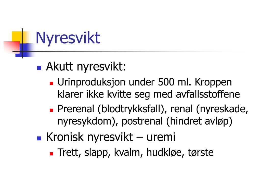 Nyresvikt • Akutt nyresvikt: • Urinproduksjon under 500 ml. Kroppen klarer ikke kvitte seg med avfallsstoffene • Prerenal (blodtrykksfall), renal (nyreskade, nyresykdom), postrenal (hindret avløp) • Kronisk nyresvikt – uremi • Trett, slapp, kvalm, hudkløe, tørste