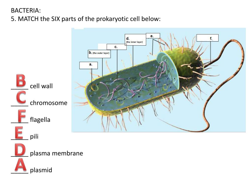 BACTERIA: 5. MATCH the SIX parts of the prokaryotic cell below: _____ cell wall _____ chromosome _____ flagella _____ pili _____ plasma membrane _____ plasmid B C F E D A