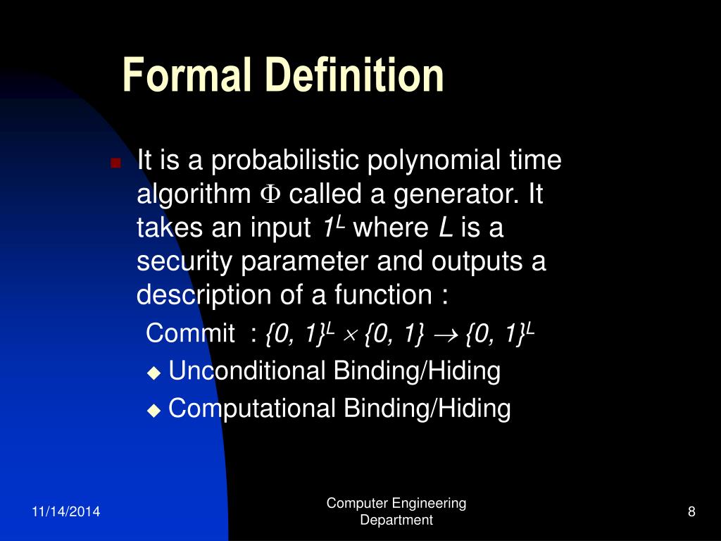 Formal Definition • It is a probabilistic polynomial time algorithm called a generator. It takes an input 1L where L is a security parameter and outputs a description of a function : Commit : {0, 1}L {0, 1} {0, 1}L • Unconditional Binding/Hiding • Computational Binding/Hiding Computer Engineering Department