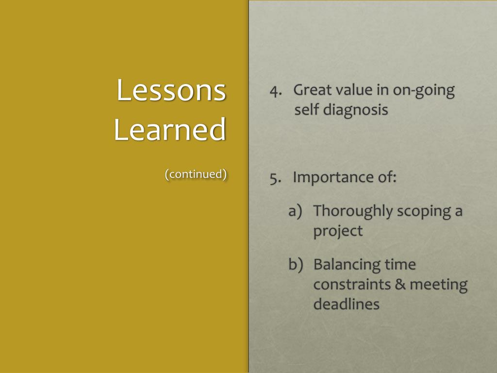 Lessons Learned 4. Great value in on-going self diagnosis 5. Importance of: • Thoroughly scoping a project • Balancing time constraints & meeting deadlines (continued)