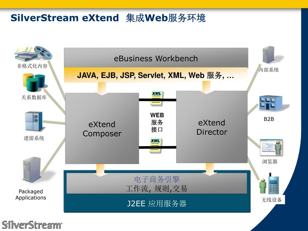 非格式化内容 内部系统 浏览器 无线设备 B2B 遗留系统 J2EE 应用服务器 电子商务引擎 工作流, 规则,交易 PackagedApplications 关系数据库 SilverStream eXtend 集成Web服务环境 eBusiness Workbench JAVA, EJB, JSP, Servlet, XML, Web 服务, … eXtend Director eXtend Composer WEB服务接口