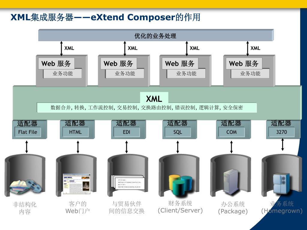 XML XML XML XML Web 服务 Web 服务 Web 服务 Web 服务 业务功能 业务功能 业务功能 业务功能 适配器 适配器 适配器 适配器 适配器 适配器 XML ST*270*0002~ BHT*0022*13*10000002*20010710*1236~ HL*1**20*1~ NM1*PR*2*DELTA DENTAL PLAN OF ST*270*0002~ BHT*0022*13*10000002*20010710*1236~ HL*1**20*1~ NM1*PR*2*DELTA DENTAL PLAN OF ST*270*0002~ BHT*0022*13*10000002*20010710*1236~ HL*1**20*1~ NM1*PR*2*DELTA DENTAL PLAN OF ST*270*0002~ BHT*0022*13*10000002*20010710*1236~ HL*1**20*1~ NM1*PR*2*DELTA DENTAL PLAN OF ST*270*0002~ BHT*0022*13*10000002*20010710*1236~ HL*1**20*1~ NM1*PR*2*DELTA DENTAL PLAN OF ST*270*0002~ BHT*0022*13*10000002*20010710*1236~ HL*1**20*1~ NM1*PR*2*DELTA DENTAL PLAN OF ST*270*0002~ BHT*0022*13*10000002*20010710*1236~ HL*1**20*1~ NM1*PR*2*DELTA DENTAL PLAN OF ST*270*0002~ BHT*0022*13*10000002*20010710*1236~ HL*1**20*1~ NM1*PR*2*DELTA DENTAL PLAN OF EDI Flat File HTML SQL COM 3270 数据合并, 转换, 工作流控制, 交易控制, 交换路由控制, 错误控制, 逻辑计算, 安全保密 XML集成服务器——eXtend Composer的作用 优化的业务处理 财务系统 (Client/Server) 业务系统 (Homegrown) 客户的 Web门户 与贸易伙伴 间的信息交换 办公系统 (Package) 非结构化内容