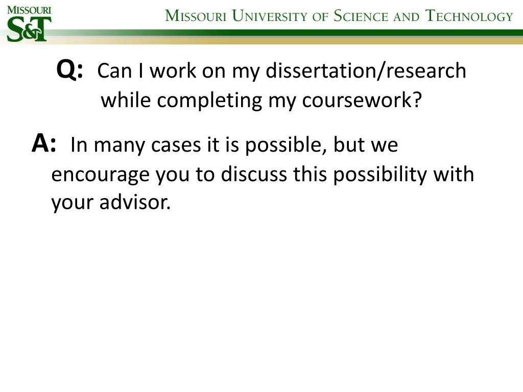Q: Can I work on my dissertation/research while completing my coursework? A: In many cases it is possible, but we encourage you to discuss this possibility with your advisor.
