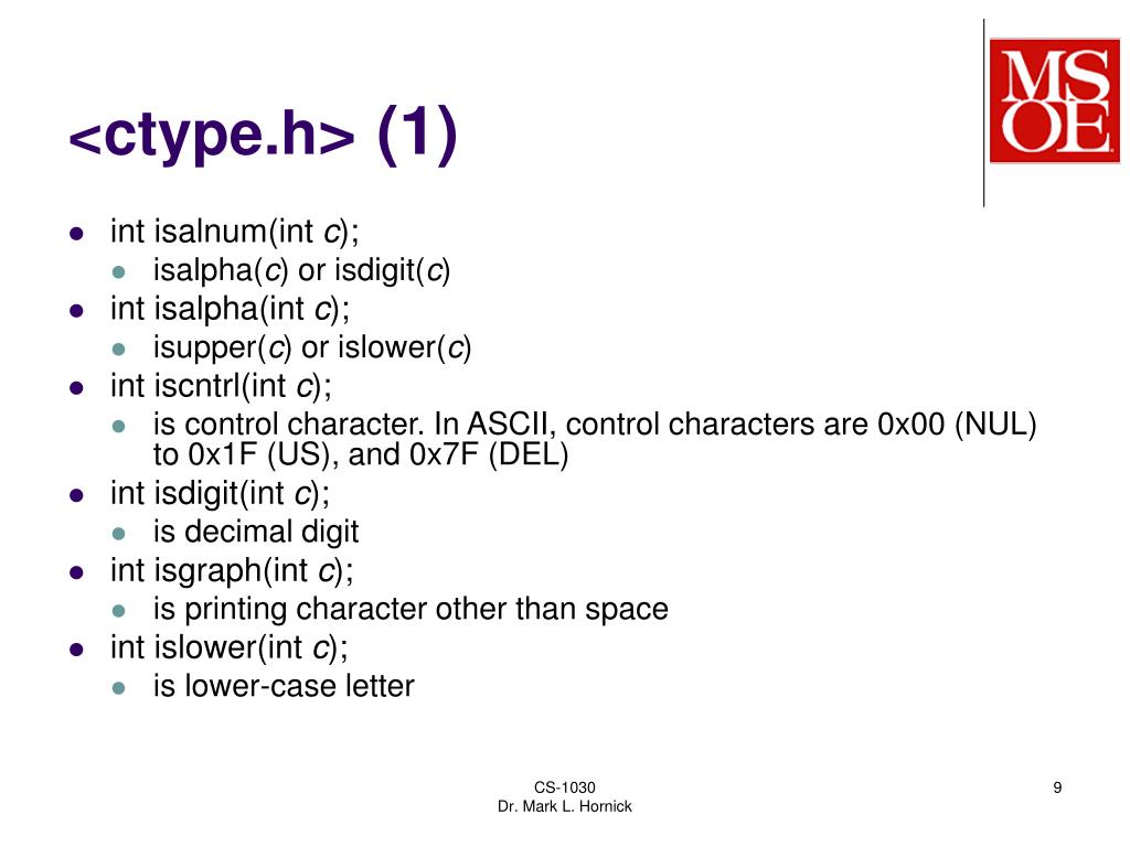 <ctype.h> (1) • int isalnum(int c); • isalpha(c) or isdigit(c) • int isalpha(int c); • isupper(c) or islower(c) • int iscntrl(int c); • is control character. In ASCII, control characters are 0x00 (NUL) to 0x1F (US), and 0x7F (DEL) • int isdigit(int c); • is decimal digit • int isgraph(int c); • is printing character other than space • int islower(int c); • is lower-case letter CS-1030 Dr. Mark L. Hornick