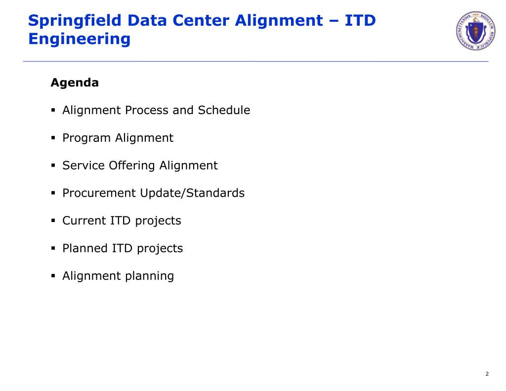 Springfield Data Center Program Alignment – ITD Engineering. Information Technology Division Executive Office for Administration and Finance. Springfield Data Center Alignment – ITD Engineering. Agenda Alignment Process and Schedule Program Alignment Service Offering Alignment