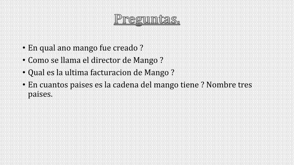 Preguntas. • En qualanomangofuecreado ? • Como se llama el director de Mango ? • Qual es la ultimafacturacion de Mango ? • En cuantospaises es la cadenadelmangotiene ? Nombre trespaises.