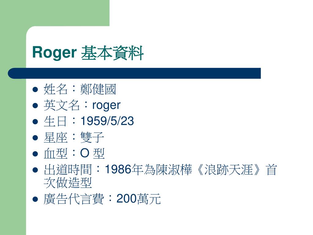Roger 基本資料 • 姓名:鄭健國 • 英文名:roger • 生日:1959/5/23 • 星座:雙子 • 血型:O 型 • 出道時間:1986年為陳淑樺《浪跡天涯》首次做造型 • 廣告代言費:200萬元