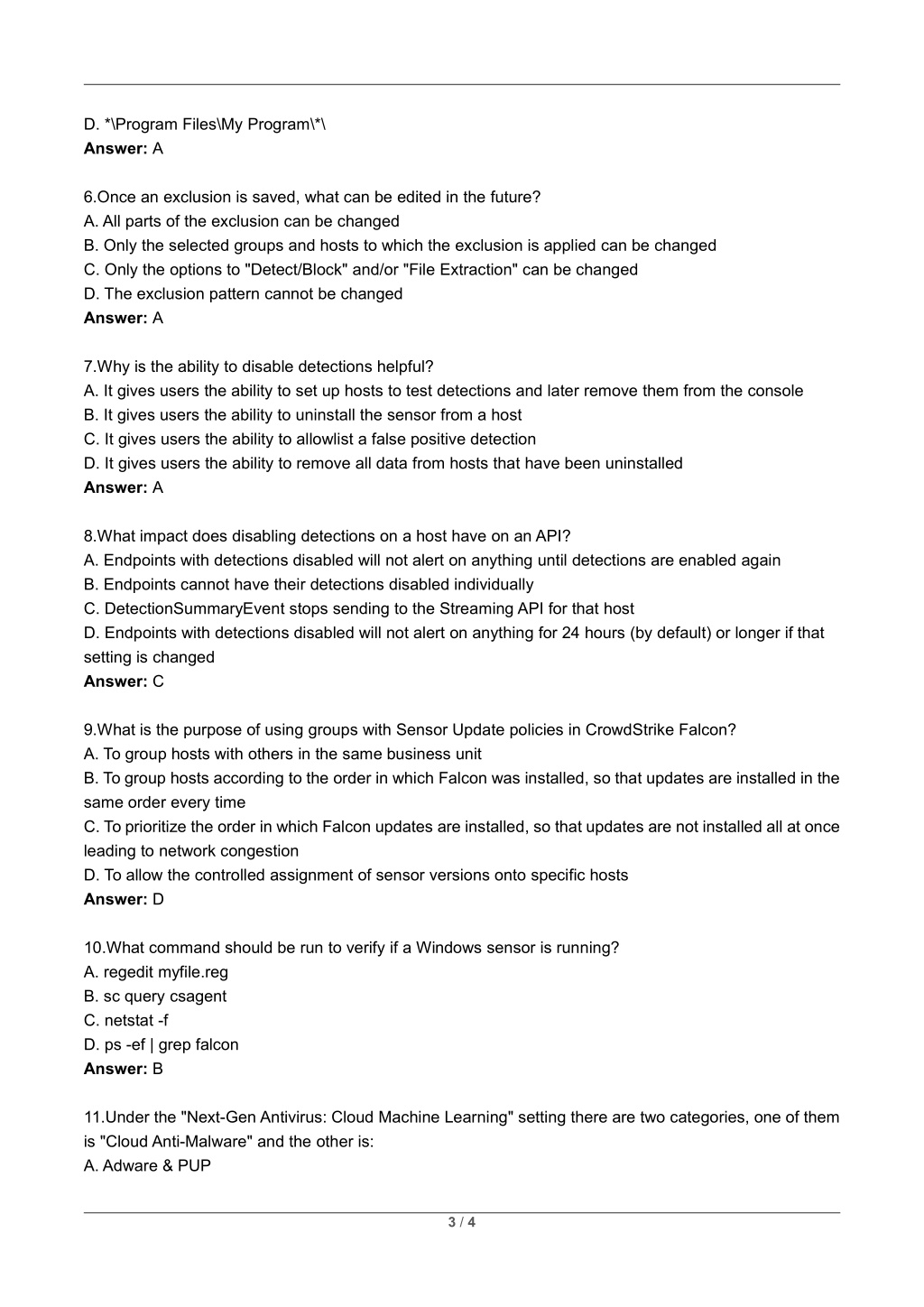 3. D. *\Program Files\My Program\*\ Answer: A 6.Once an exclusion is saved, what can be edited in the future? A. All parts of the exclusion can be changed B. Only the selected groups and hosts to which the exclusion is applied can be changed C. Only the options to "Detect/Block" and/or "File Extraction" can be changed D. The exclusion pattern cannot be changed Answer: A 7.Why is the ability to disable detections helpful? A. It gives users the ability to set up hosts to test detections and later remove them from the console B. It gives users the ability to uninstall the sensor from a host C. It gives users the ability to allowlist a false positive detection D. It gives users the ability to remove all data from hosts that have been uninstalled Answer: A 8.What impact does disabling detections on a host have on an API? A. Endpoints with detections disabled will not alert on anything until detections are enabled again B. Endpoints cannot have their detections disabled individually C. DetectionSummaryEvent stops sending to the Streaming API for that host D. Endpoints with detections disabled will not alert on anything for 24 hours (by default) or longer if that setting is changed Answer: C 9.What is the purpose of using groups with Sensor Update policies in CrowdStrike Falcon? A. To group hosts with others in the same business unit B. To group hosts according to the order in which Falcon was installed, so that updates are installed in the same order every time C. To prioritize the order in which Falcon updates are installed, so that updates are not installed all at once leading to network congestion D. To allow the controlled assignment of sensor versions onto specific hosts Answer: D 10.What command should be run to verify if a Windows sensor is running? A. regedit myfile.reg B. sc query csagent C. netstat -f D. ps -ef | grep falcon Answer: B 11.Under the "Next-Gen Antivirus: Cloud Machine Learning" setting there are two categories, one of them is "Cloud Anti-Malware" and the other is: A. Adware & PUP 3 / 4