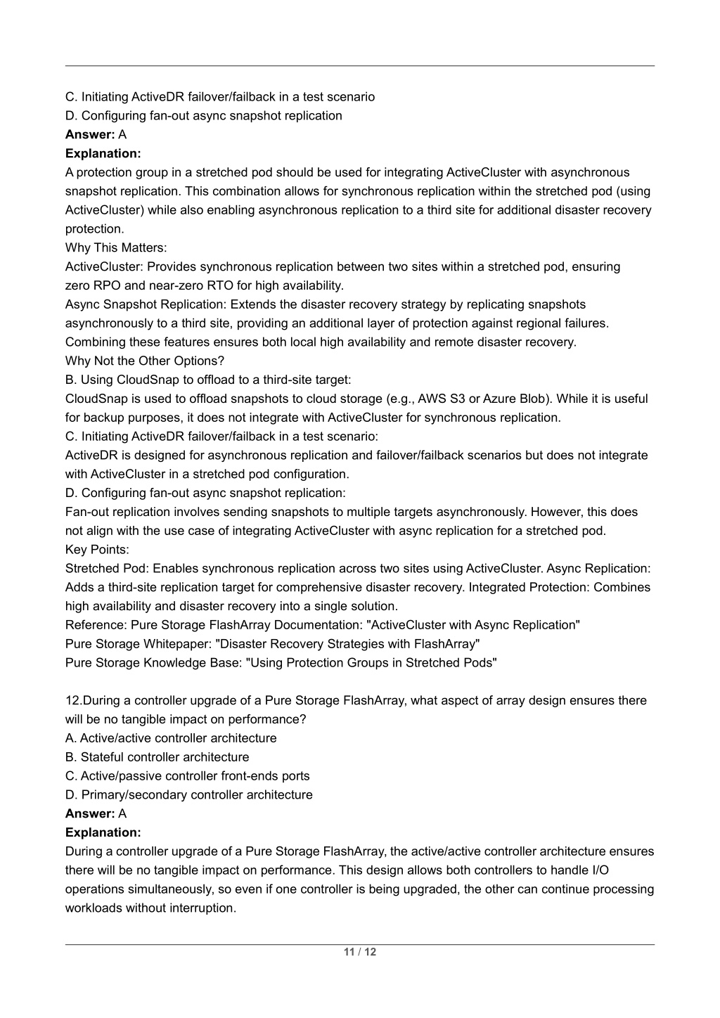 C. Initiating ActiveDR failover/failback in a test scenario D. Configuring fan-out async snapshot replication Answer: A Explanation: A protection group in a stretched pod should be used for integrating ActiveCluster with asynchronous snapshot replication. This combination allows for synchronous replication within the stretched pod (using ActiveCluster) while also enabling asynchronous replication to a third site for additional disaster recovery protection. Why This Matters: ActiveCluster: Provides synchronous replication between two sites within a stretched pod, ensuring zero RPO and near-zero RTO for high availability. Async Snapshot Replication: Extends the disaster recovery strategy by replicating snapshots asynchronously to a third site, providing an additional layer of protection against regional failures. Combining these features ensures both local high availability and remote disaster recovery. Why Not the Other Options? B. Using CloudSnap to offload to a third-site target: CloudSnap is used to offload snapshots to cloud storage (e.g., AWS S3 or Azure Blob). While it is useful for backup purposes, it does not integrate with ActiveCluster for synchronous replication. C. Initiating ActiveDR failover/failback in a test scenario: ActiveDR is designed for asynchronous replication and failover/failback scenarios but does not integrate with ActiveCluster in a stretched pod configuration. D. Configuring fan-out async snapshot replication: Fan-out replication involves sending snapshots to multiple targets asynchronously. However, this does not align with the use case of integrating ActiveCluster with async replication for a stretched pod. Key Points: Stretched Pod: Enables synchronous replication across two sites using ActiveCluster. Async Replication: Adds a third-site replication target for comprehensive disaster recovery. Integrated Protection: Combines high availability and disaster recovery into a single solution. Reference: Pure Storage FlashArray Documentation: "ActiveCluster with Async Replication" Pure Storage Whitepaper: "Disaster Recovery Strategies with FlashArray" Pure Storage Knowledge Base: "Using Protection Groups in Stretched Pods" 12.During a controller upgrade of a Pure Storage FlashArray, what aspect of array design ensures there will be no tangible impact on performance? A. Active/active controller architecture B. Stateful controller architecture C. Active/passive controller front-ends ports D. Primary/secondary controller architecture Answer: A Explanation: During a controller upgrade of a Pure Storage FlashArray, the active/active controller architecture ensures there will be no tangible impact on performance. This design allows both controllers to handle I/O operations simultaneously, so even if one controller is being upgraded, the other can continue processing workloads without interruption. 11 / 12