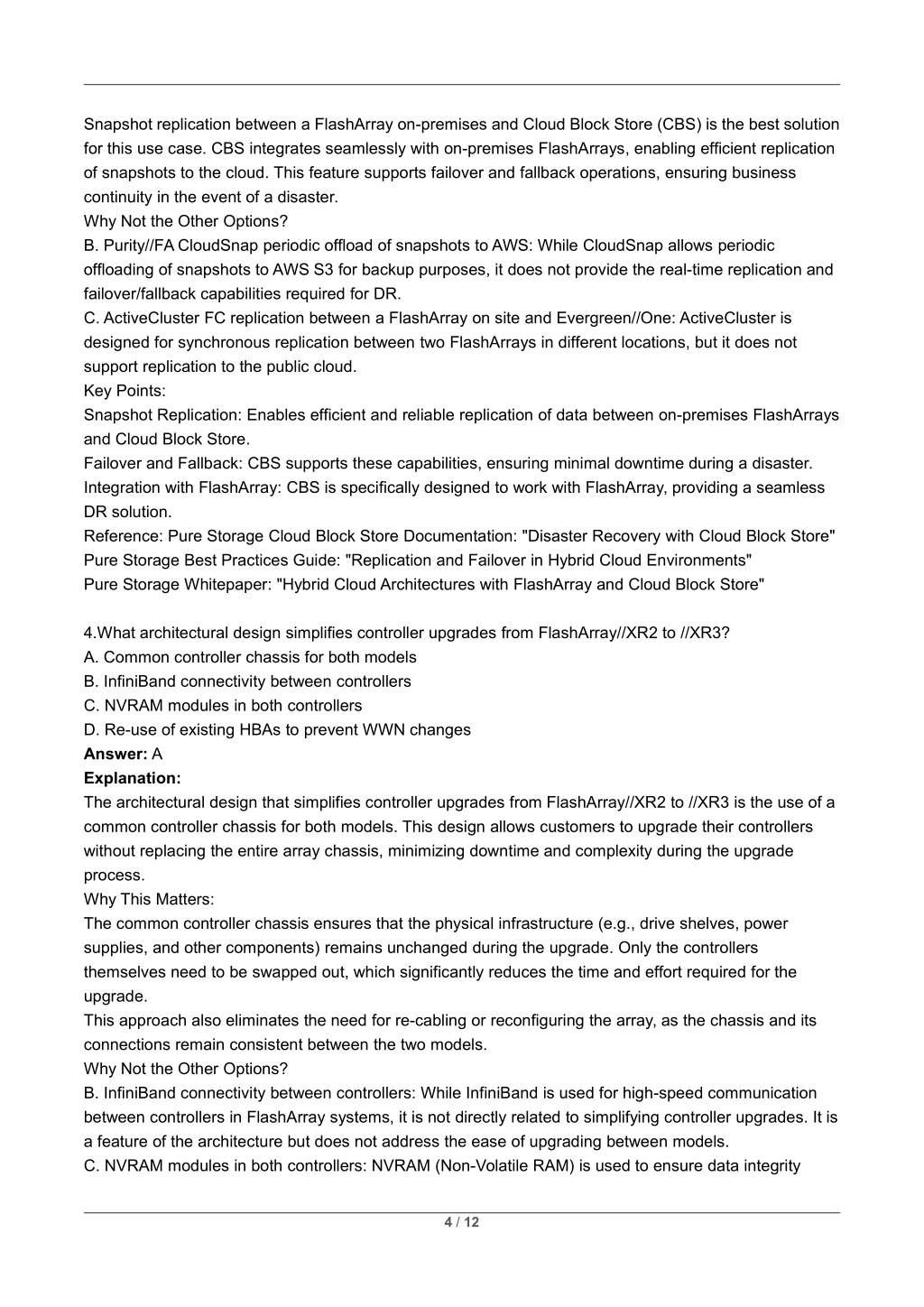Snapshot replication between a FlashArray on-premises and Cloud Block Store (CBS) is the best solution for this use case. CBS integrates seamlessly with on-premises FlashArrays, enabling efficient replication of snapshots to the cloud. This feature supports failover and fallback operations, ensuring business continuity in the event of a disaster. Why Not the Other Options? B. Purity//FA CloudSnap periodic offload of snapshots to AWS: While CloudSnap allows periodic offloading of snapshots to AWS S3 for backup purposes, it does not provide the real-time replication and failover/fallback capabilities required for DR. C. ActiveCluster FC replication between a FlashArray on site and Evergreen//One: ActiveCluster is designed for synchronous replication between two FlashArrays in different locations, but it does not support replication to the public cloud. Key Points: Snapshot Replication: Enables efficient and reliable replication of data between on-premises FlashArrays and Cloud Block Store. Failover and Fallback: CBS supports these capabilities, ensuring minimal downtime during a disaster. Integration with FlashArray: CBS is specifically designed to work with FlashArray, providing a seamless DR solution. Reference: Pure Storage Cloud Block Store Documentation: "Disaster Recovery with Cloud Block Store" Pure Storage Best Practices Guide: "Replication and Failover in Hybrid Cloud Environments" Pure Storage Whitepaper: "Hybrid Cloud Architectures with FlashArray and Cloud Block Store" 4.What architectural design simplifies controller upgrades from FlashArray//XR2 to //XR3? A. Common controller chassis for both models B. InfiniBand connectivity between controllers C. NVRAM modules in both controllers D. Re-use of existing HBAs to prevent WWN changes Answer: A Explanation: The architectural design that simplifies controller upgrades from FlashArray//XR2 to //XR3 is the use of a common controller chassis for both models. This design allows customers to upgrade their controllers without replacing the entire array chassis, minimizing downtime and complexity during the upgrade process. Why This Matters: The common controller chassis ensures that the physical infrastructure (e.g., drive shelves, power supplies, and other components) remains unchanged during the upgrade. Only the controllers themselves need to be swapped out, which significantly reduces the time and effort required for the upgrade. This approach also eliminates the need for re-cabling or reconfiguring the array, as the chassis and its connections remain consistent between the two models. Why Not the Other Options? B. InfiniBand connectivity between controllers: While InfiniBand is used for high-speed communication between controllers in FlashArray systems, it is not directly related to simplifying controller upgrades. It is a feature of the architecture but does not address the ease of upgrading between models. C. NVRAM modules in both controllers: NVRAM (Non-Volatile RAM) is used to ensure data integrity 4 / 12